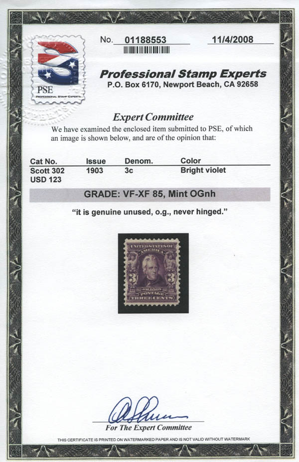 Lote 317![]() ![]() 1903, 3¢ Jackson (Scott 302), outstandingly well centered, o.g., never hinged, Very Fine to Extremely Fine, with 2008 P.S.E. certificate graded VF-XF 85. Scott $140. SMQ $200. Estimate $120 - 180. |