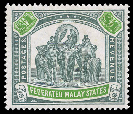 Lote 324![]() ![]() Malaysia: Federated Malay States, 1907, "Malay Elephants", $1 gray green & green, Multiple Crown CA watermark (SG 48. Scott 34), a premium quality example, o.g., never hinged, Very Fine. Catalog values are for hinged, never hinged carries a premium. SG £130 ($170). Scott $110. Estimate $60 - 80. |
