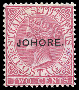 Lote 326 ( ![]() Malay States: Johore, 1885, "JOHORE" on Straits Settlements 2¢ pale rose (SG 6. Scott 1A), fresh and well centered, unused without gum, Very Fine. Catalog values are for o.g. SG £250 ($320). Scott $225. Estimate $40 - 60. |