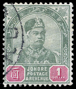 Malay States: Johore, 1891, Sultan Abubakar, $1 green & carmine (SG 27. Scott 24), the high value of the set, Fine used. SG £180 ($230). Scott $190.
