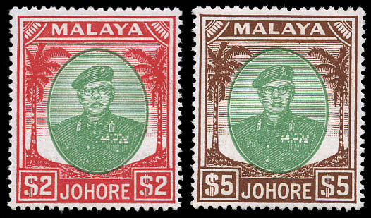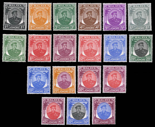 Malay States: Johore, 1949-55, Sultan Ibrahim, 1¢ to $5 complete (SG 133/147. Scott 130-150), set of 21, o.g., lightly hinged, mostly Very Fine. SG £160 ($200). Scott $181.