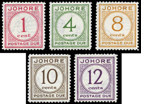 Malay States: Johore, Postage Dues, 1938, 1¢ to 12¢ complete (SG D1/D5. Scott J1-J5), o.g., hinged or small hinge remnant, Fine to Very Fine. SG £200 ($260). Scott $228.