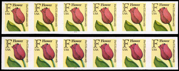 1991 (29¢) "F" Tulip, horizontal coil, imperf. (Scott 2518a), plate numbers 1111 and 2222 strips of 6, o.g., never hinged, Very Fine. Scott $150 as pairs.