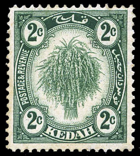 Malay States: Kedah, 1940, Sheaf of Rice, 2¢ dull green, type II, Multiple Script CA watermark (SG 27 var. Scott 25a), o.g., hinged, Fine to Very Fine. Scott $350.