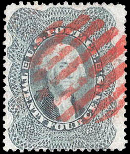 1860, 24¢ Washington, gray lilac (Scott 37), nicely centered for this issue, neatly struck red grid cancel, Fine, with 2008 P.S.E. certificate. Scott $400.