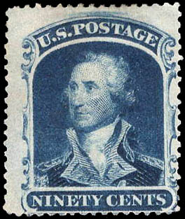 1860, 90¢ Washington, blue (Scott 39), o.g., heavy hinge remnant, Very Good to Fine. Scott $3,000.