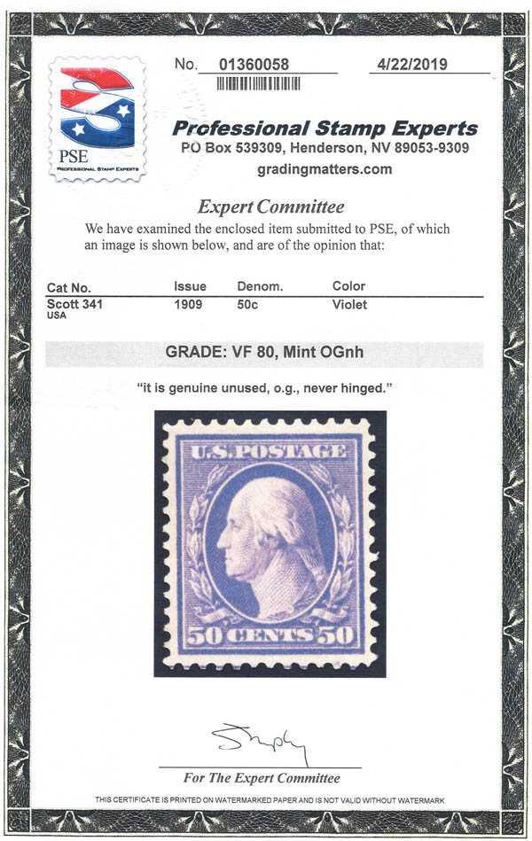 1909, 50¢ Washington, violet, D.L. watermark (Scott 341), o.g., never hinged, Very Fine, with 2019 P.S.E. certificate graded VF 80. Scott $650. SMQ $700.