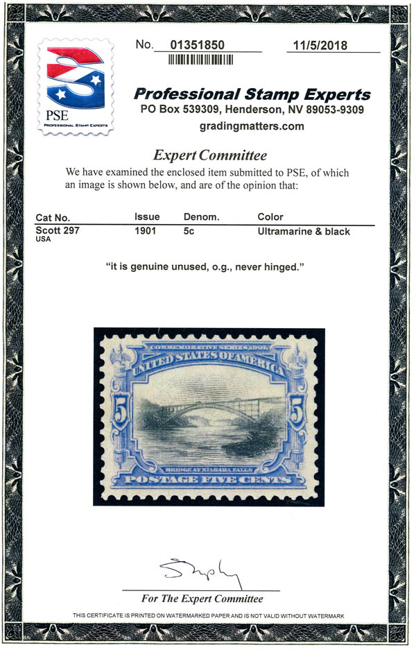 1901, 5¢ Pan-American (Scott 297), o.g., never hinged, Fine, with 2018 P.S.E. certificate. Scott $180.