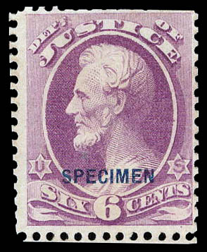 Justice Dept., 1875 Special Printing, 6¢ purple, overprinted "Specimen" (Scott O28SD), usual scissor cut perfs, without gum as issued, Fine for the issue. Scott $1,250.