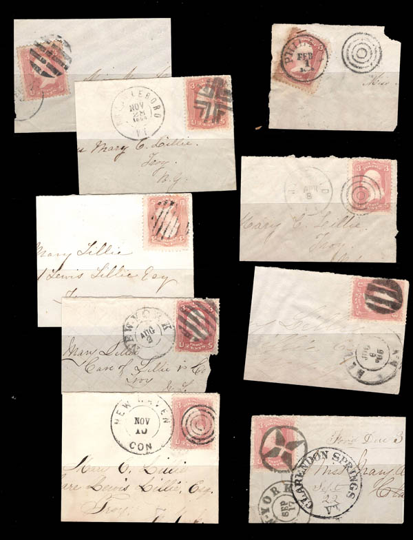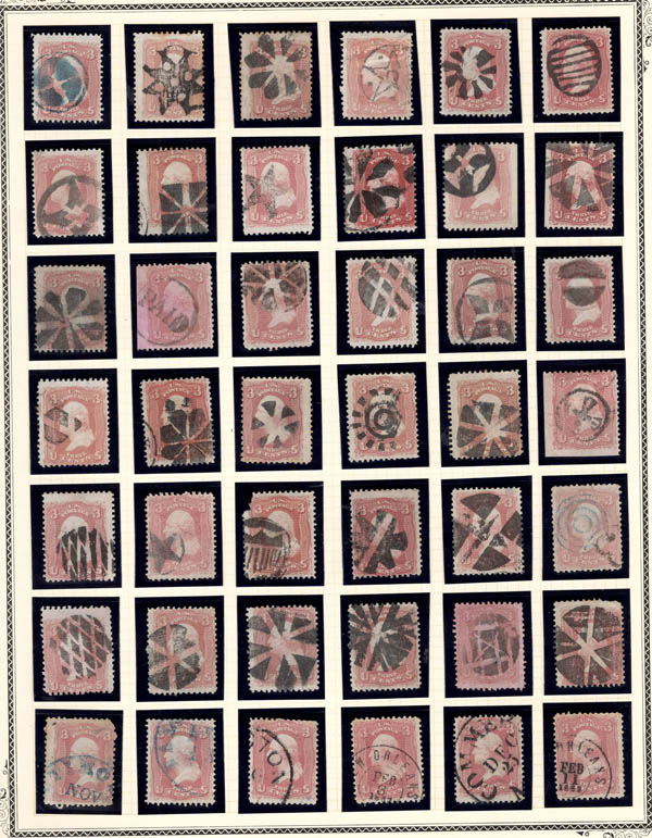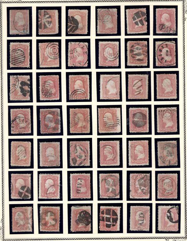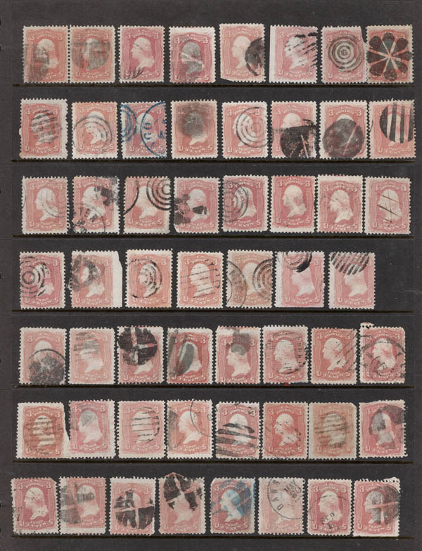 Lote 374 o 1861, 3¢ Washington, rose, an epic assemblage of 148 stamps (Scott 65), many with unique cancels, some fancy plus a few other premium cancels, in various shades. The centering ranges from Superb to V.G. An excellent study - worthy of a close look, who knows what tidbit you may find in this beautiful lot! Estimate $600 - 800. |