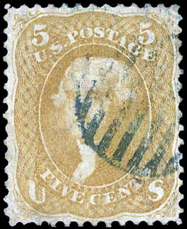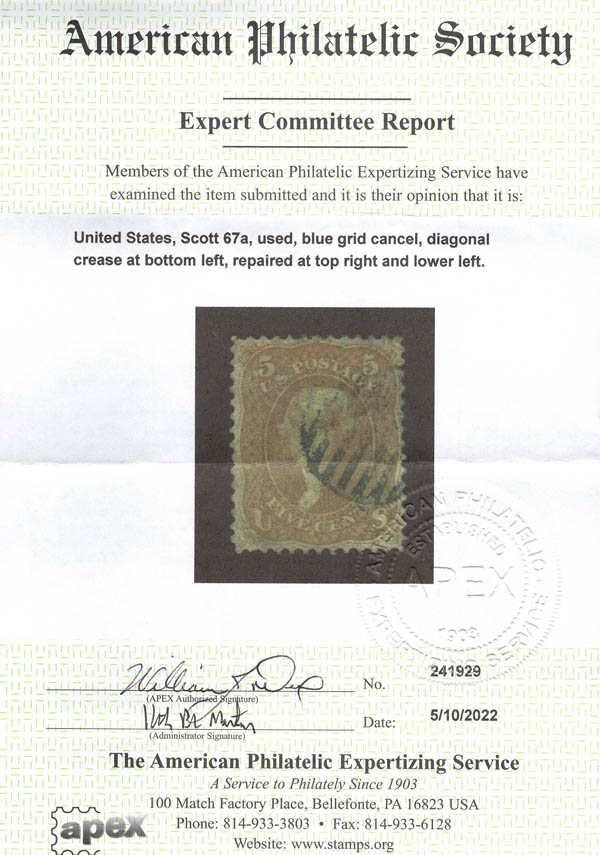 Lote 377 o 1861, 5¢ Jefferson, brown yellow (Scott 67a), well centered, with excellent color, blue grid cancel; a diagonal crease at bottom left, repaired at top right and lower left, Very Fine appearing, with 2022 A.P.S. certificate. Scott $1,100. Estimate $200 - 300. |
