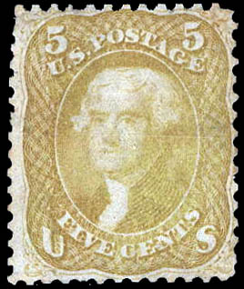 Lote 378 o 1861, 5¢ Jefferson, olive yellow (Scott 67b), cleaned to remove cancel and regummed; reperforated and with other small faults; still a genuine example of this rare color variety, Fine appearance, with 2008 Weiss certificate. Scott $4,850. Estimate $600 - 800. |