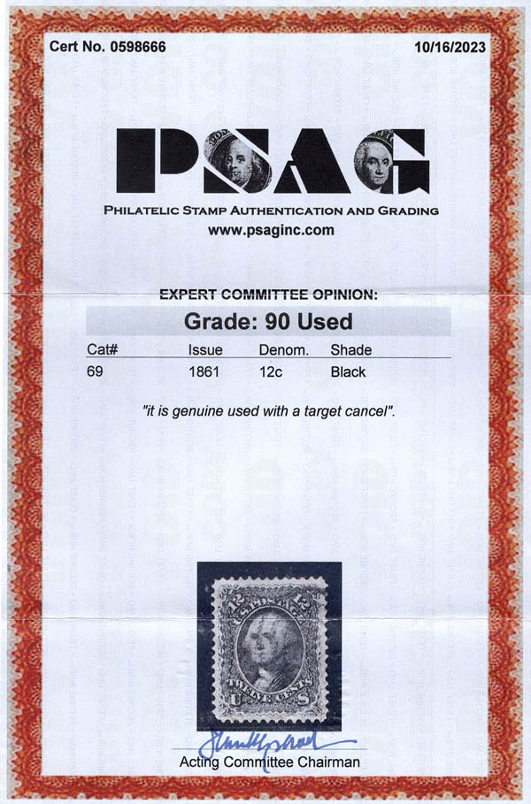 Lote 381 o 1861, 12¢ Washington, black (Scott 69), wonderfully well centered, target cancel, Extremely Fine, with 2023 P.S.A.G. certificate graded XF 90. Scott $100. SMQ $300. Scott Stamp Values $300. Estimate $200 - 300. |