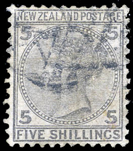 New Zealand, 1878, Queen Victoria "Side Face", 5s gray, perf. 12 x 11½ "N Z" and Star watermark (SG 186. Scott 60), Fine to Very Fine used. SG £325 ($410). Scott $500.