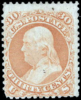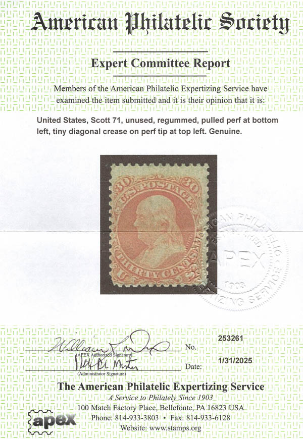 Lote 388 ( )1861, 30¢ Franklin, orange (Scott 71), regummed; perf faults including pulled perf, a tiny diagonal crease on perf tip at top left and reperfed at bottom, Very Good to Fine, with 2025 A.P.S. certificate. Scott $1,000. Estimate $150 - 200. |