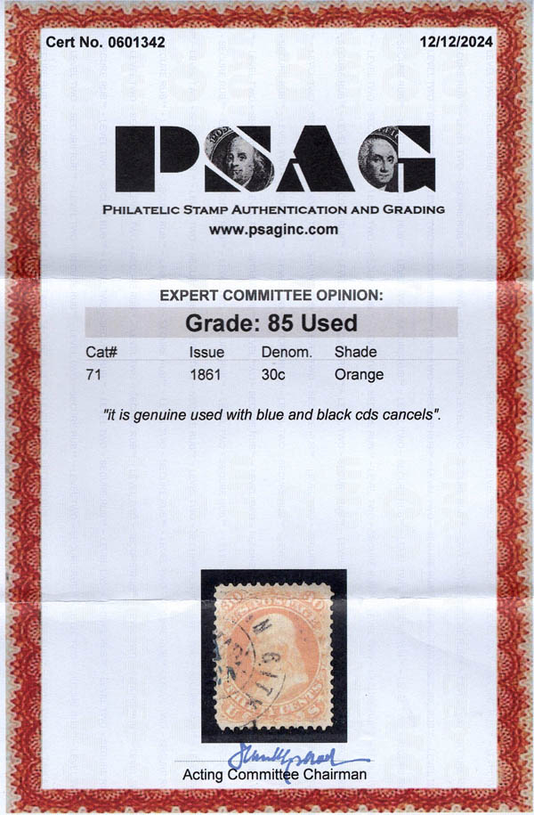 Lote 389 o 1861, 30¢ Franklin, orange (Scott 71), with blue and black cancels, Very Fine to Extremely Fine, with 2025 P.S.A.G. certificate graded VF-XF 85. Scott $265. SMQ $375. Scott Stamp Values $375. Estimate $250 - 350. |