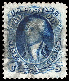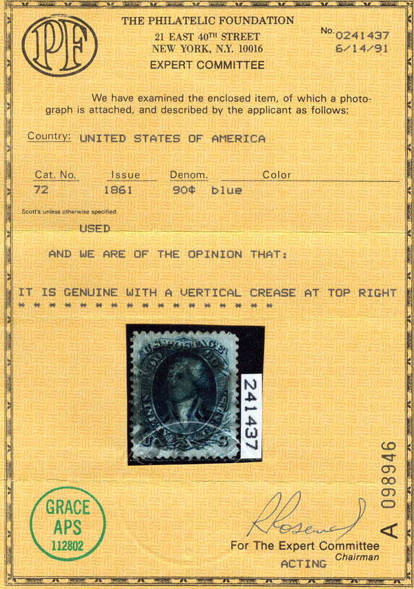 Lote 390 o 1861, 90¢ Washington, blue (Scott 72), magnificent centering and large margins; a vertical crease at top right, otherwise Extremely Fine, with 1991 P.F. certificate. Scott $625. Estimate $300 - 400. |