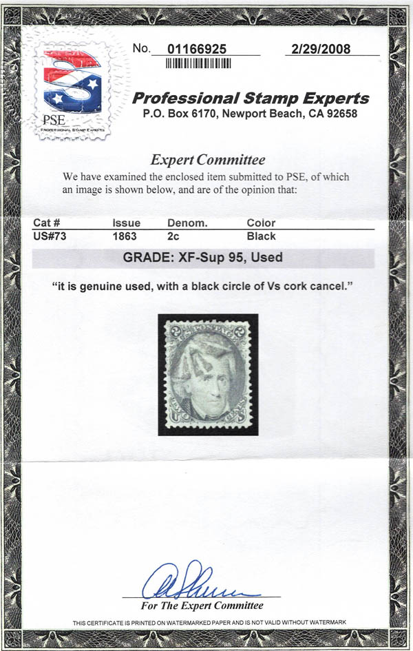 Lote 393 o 1863, 2¢ Jackson, black (Scott 73), spectacular centering, with intense shade and impression, and a beautifully struck circle of V's cancel, Extremely Fine to Superb, with 2008 P.S.E. certificate graded XF-SUP 95. Scott $75. SMQ $950. Estimate $750 - 1,000. |