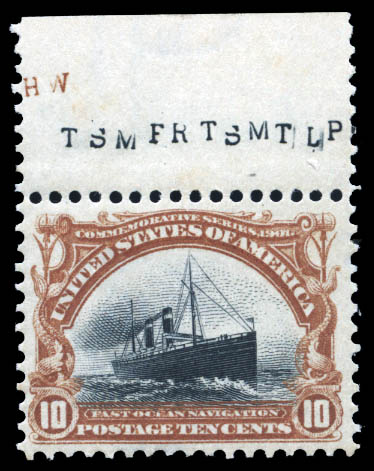 1901, 10¢ Pan-American (Scott 299), a beautiful top margin single, exceptionally well centered, o.g., never hinged, Very Fine to Extremely Fine. Scott $300.