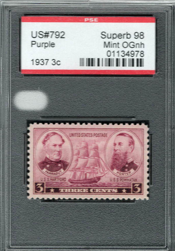 1937, 3¢ Navy (Scott 792), a perfectly centered gem, o.g., never hinged, Superb, with encapsulated P.S.E. certificate graded SUP 98. SMQ $80.