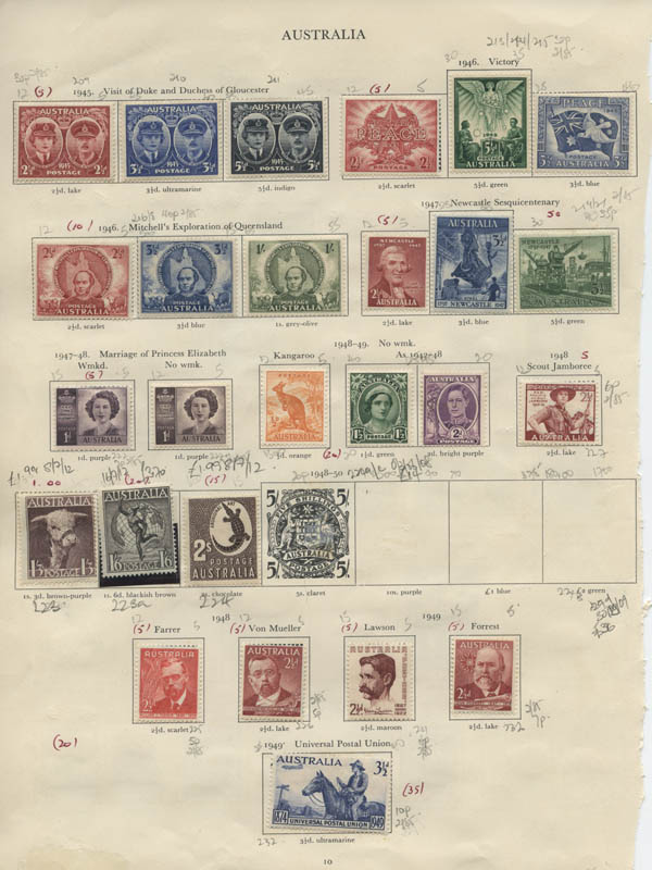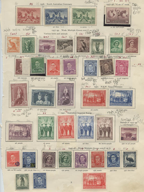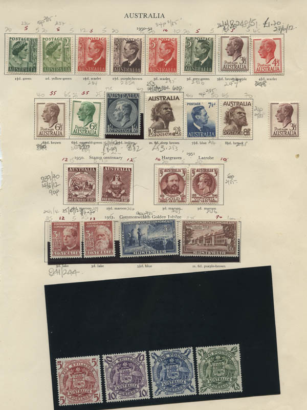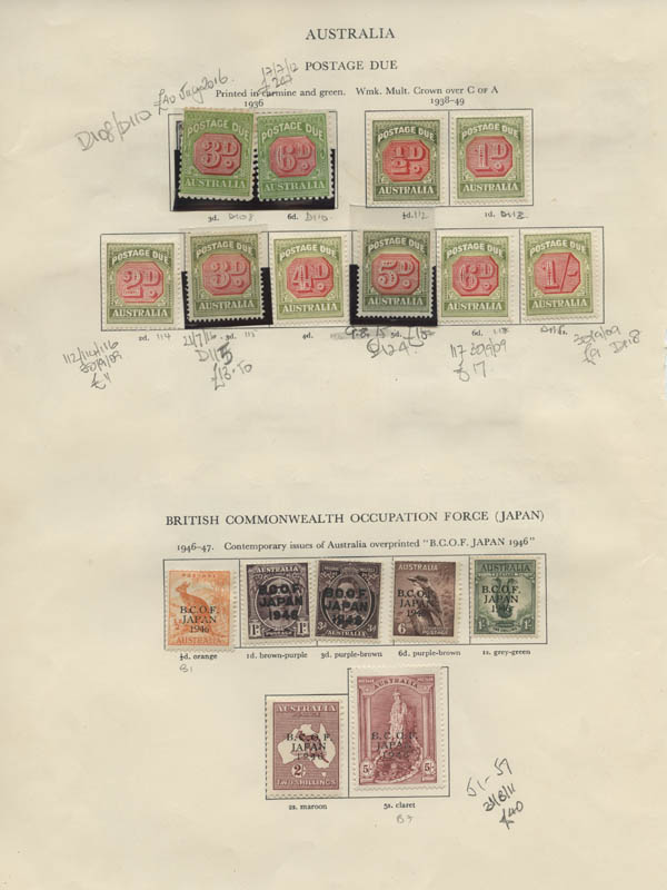 Lote 4![]() Australia, 1937-52, King George VI issues complete (Scott 163-249, C5-6, J64-70, M1-7), including regular issues, airmail, postage dues and military stamps. Noteworthy are the 1937-46 Robes definitives ($161), the 1949-50 Arms definitives ($253), the 1938 postage due set ($257) and the 1946-47 B.C.O.F. set ($209). Fresh and clean throughout, o.g., hinged on Gibbons pages, Fine to Very Fine. A great lot for the collector or dealer. Scott $1,133. SG 164/254, D112/18, J1/7a; £1,067 ($1,310). Estimate $300 - 400. |