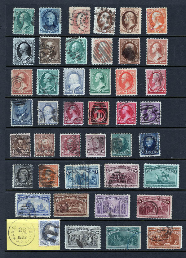 Lote 407 o U.S., 1852-1913, a used collection balance, neatly mounted on black stock sheets. Includes Scott #9, 10, 24, 25, 26, 35, 63, 65, 68, 71 (nibbed corner), 72, 73, 75, 78b, 88, 89, 94, 97, 112, 113, 114, 115, 117, 136, 145, 146, 147, 148, 149, 150, 151, 153, 154, 156, 157, 158, 159, 160, 161, 162, 163, 165, 178, 179, 182, 183, 184, 185, 186, 187, 188, 189, 190, 205, 206 (on piece), 207, 208, 209, 210, 211 (x2), 212, 213, 214, 215, 216, 219, 219D, 220, 220C, 221, 222, 223, 224, 225, 226 227, 228, 229, some Columbians #230, 231, 232, 233, 234, 235, 236, 237, 238, 239, 246, 247, 248, 249, 250, 251, 252, 253, 254, 255, 256, 257, 258, 260, 264, 265, 266, 267, 268,269,270,271, 272, 273, 274, 279, 279B, 280, 281, 282, 282C, 283, 284, some Trans-Mississippis #285, 286, 287, 288, 289, 290, a set of Pan-Ams #294, 295, 296, 297, 298, 299, a complete Louisiana Purchase set #323, 324, 325, 326, 327, and finally a few Pan Pacifics #399, 400 and 400A; there may be a few faults throughout including some thins, some are s.e.'s and most are nicely centered; all imaged on the website, with some interesting as well as premium color cancels, overall Fine to Very Fine. Scott $6,865. Estimate $750 - 1,000. |