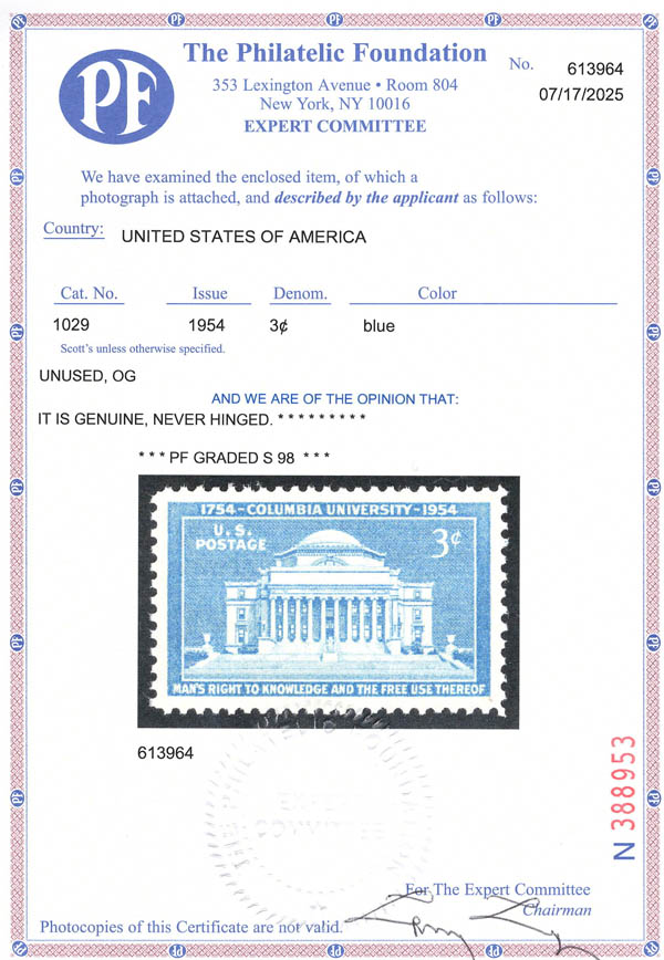 Lote 438![]() ![]() 1954-56, a group of 4 superb graded stamps (Scott 1029, 1068, 1070, 1080), including 1954, 3¢ Columbia University; 1955, 3¢ New Hampshire; 1955, 3¢ Atoms for Peace; and 1956, 3¢ Pure Food & Drug Laws, o.g., never hinged, Superb, all with 2025 P.F. certificates graded SUP 98. SMQ $265. Estimate $120 - 180. |