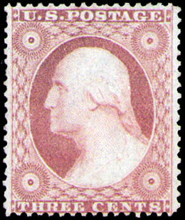 1857, 3¢ Washington, dull red, type III (Scott 26), very well centered for this issue, o.g., lightly hinged, Very Fine. Scott $65.