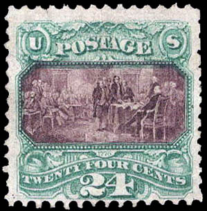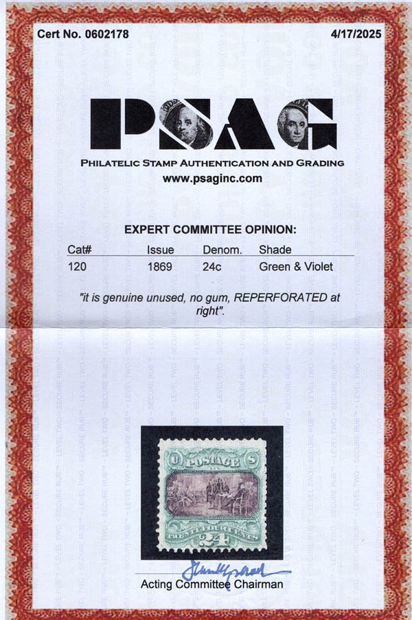Lote 441 ( )1869, 24¢ Declaration of Independence, green & violet (Scott 120), attractive color and centering, unused without gum; reperfed at right, Fine to Very Fine appearance, with 2025 P.S.A.G. certificate. Scott $3,000. Estimate $750 - 1,000. |