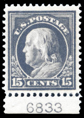 Lote 443![]() ![]() 1912, 15¢ Franklin, gray, S.L. watermark, perf 12 (Scott 418), plate number single, fresh and well centered, pristine o.g., never hinged, Very Fine to Extremely Fine. Scott $190. Estimate $120 - 150. |