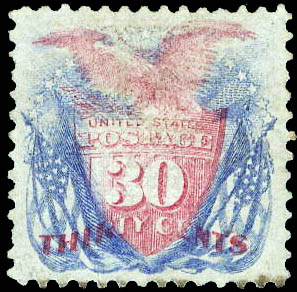 Lote 444 ( )1869, 30¢ Shield, Eagle and Flags, ultramarine & carmine (Scott 121), beautifully well centered, unused without gum; faults including some toning at bottom, stains and tiny creases in margin, otherwise Very Fine, with 1973 P.F. certificate. Scott $1,400. Estimate $350 - 500. |