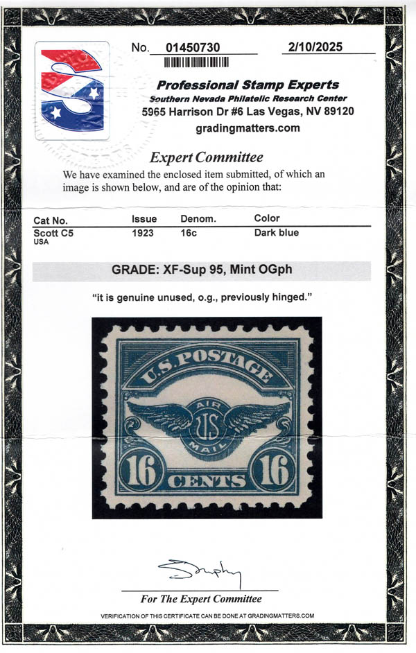 Airmail, 1923, 16¢ Winged Emblem (Scott C5), o.g., very lightly hinged, Extremely Fine to Superb, with 2025 P.S.E. certificate graded XF-SUP 95. Scott $60. SMQ $140.