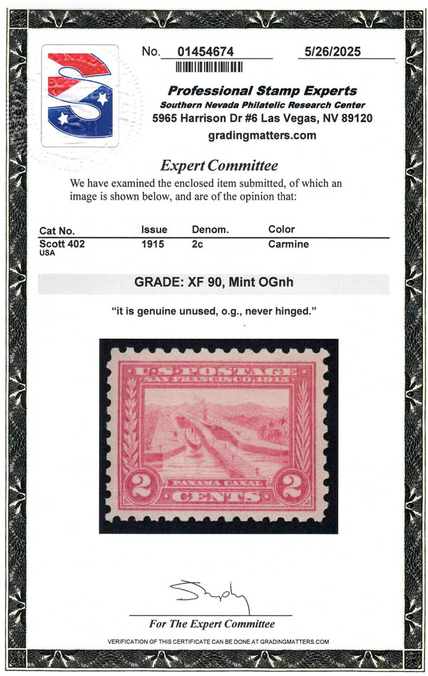 1915, 2¢ Panama-Pacific, perf. 10 (Scott 402), o.g., never hinged, Extremely Fine, with 2025 P.S.E. certificate graded XF 90. Scott $170. SMQ $325.