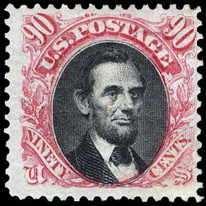Lote 454![]() 1869 (1875 Re-issue), 90¢ Lincoln, carmine & black (Scott 132), excellent color, o.g., hinged; light horizontal crease and repaired perf at the right, Fine appearance, only 1356 sold. Scott $3,750. Estimate $600 - 800. |