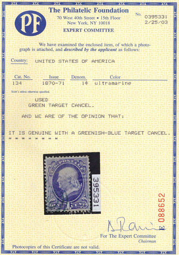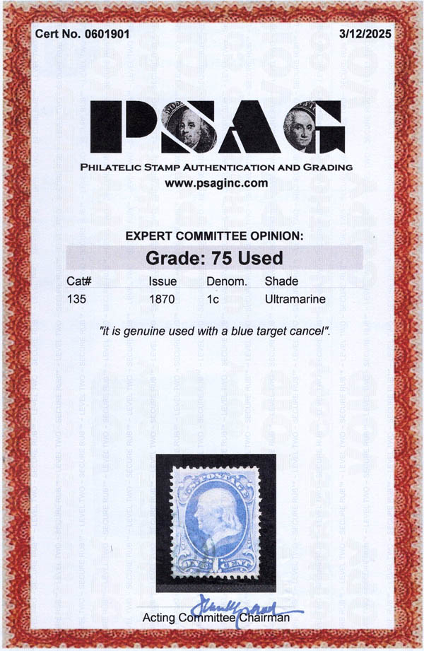 Lote 455 o 1870, 1¢ Franklin, ultramarine, H. grill, N.B.N.C. printing (Scott 134), premium blue target cancel, Fine to Very Fine, with 2025 P.S.A.G. certificate graded F-VF 75. Scott $235. SMQ $135. Scott Stamp Values $125. Estimate $80 - 120. |