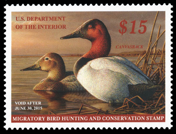 Federal Duck Stamp, 2014, $15 Canvasbacks (Scott RW81), a perfectly centered gem, o.g., never hinged, Superb, with 2014 P.S.E. certificate graded Gem 100. SMQ $190.