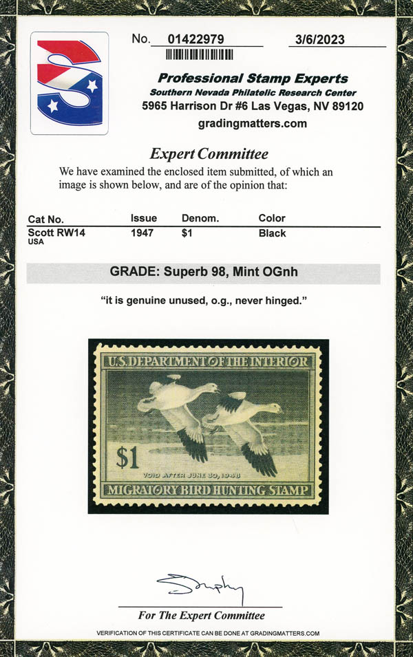 Federal Duck Stamp, 1947, $1 Snow Geese (Scott RW14), o.g., never hinged, Superb, with 2023 P.S.E. certificate graded SUP 98. SMQ $600.