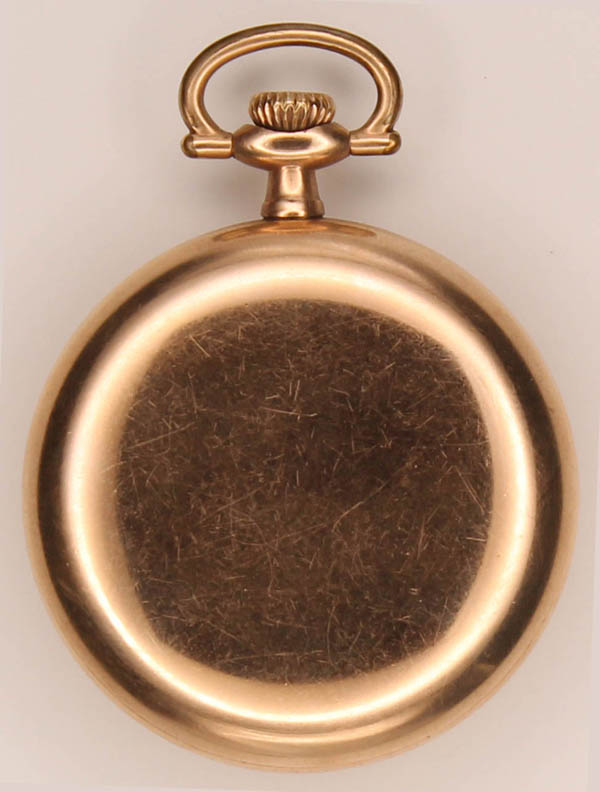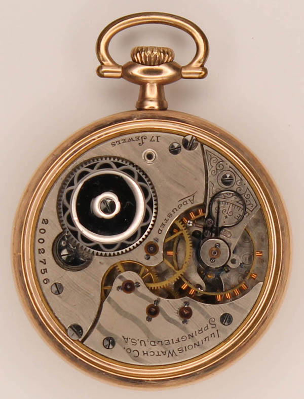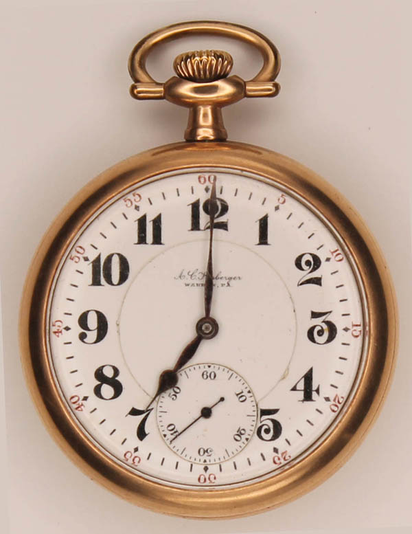 Lote 46 Illinois Watch Co. vintage pocket watch. Grade 175 "AJKirberger" model 6, 17 jewels. (Kirkberger was a jeweler in Warren, PA). White enamel face with Arabic numerals and double sunk second sweep. Nickel partial plate. Gold plated case. Size 18s; serial no. 2002756; circa 1907. Very good condition, working at time of cataloguing. Estimate $50 - 75. |