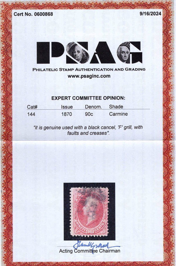 1870, 90¢ Perry, carmine, H. grill, N.B.N.C. printing (Scott 144); sealed tear and creases, Fine centering, with 2024 P.S.A.G. certificate. Scott $2,350.