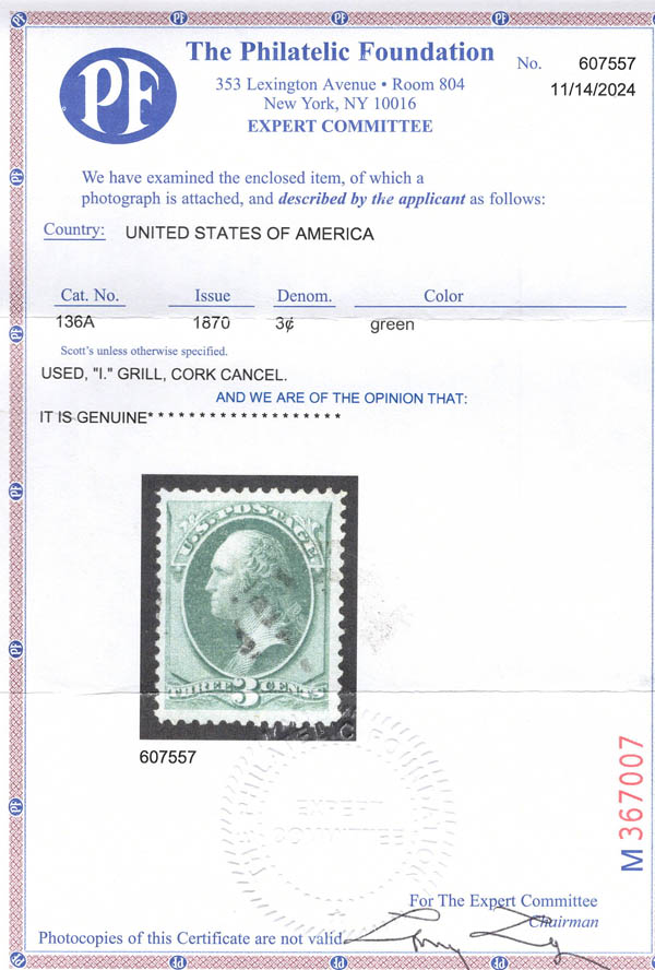 Lote 462 o 1870, 3¢ Washington, green, I. grill, N.B.N.C. printing (Scott 136A), well centered, very lightly canceled, Very Fine to Extremely Fine, with 2024 P.F. certificate. Scott $100. Estimate $100 - 150. |