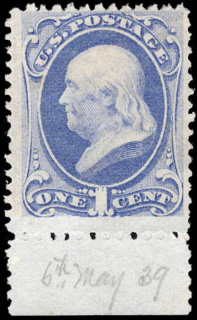 1870, 1¢ Franklin, ultramarine, without grill, N.B.N.C. printing (Scott 145), slightly disturbed o.g., Fine. Scott $700.