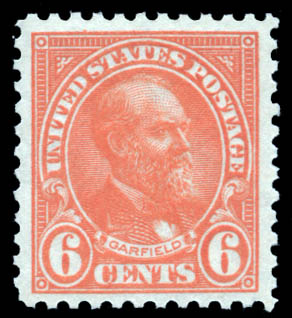 1922, 6¢ Garfield (Scott 558), a beauty with near perfect centering, o.g., never hinged (trivial perf disc indent on gum), Extremely Fine. Scott $65.