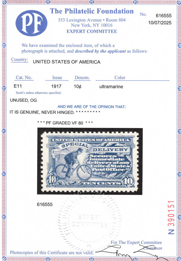 Special Delivery, 1917, 10¢ ultramarine (Scott E11), o.g., never hinged, Very Fine, with 2025 P.F. certificate graded VF 80. Scott $45.