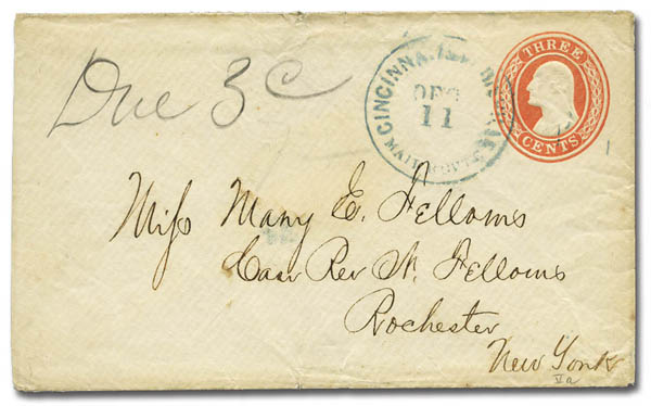 Lote 48![]() Envelope, 1854, Nesbitt 1st Issue, 3¢ red on buff (Scott U10), entire, with LOUISVILLE & CINCINNATTI MAIL LINE route postmark, addressed to Rochester, N.Y., underpaid (note the "Due 3¢"); slightly reduced at left, Fine to Very Fine. Estimate $150 - 200 Ohio River to Kentucky River to Louisville to Rochester . |