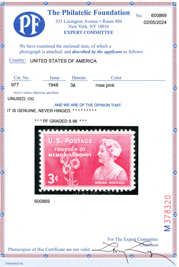1948, 3¢ Moina Michael (Scott 977), o.g., never hinged, Superb, with 2024 P.F. certificate graded SUP 98. SMQ $60.