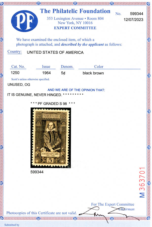 1964, 5¢ Shakespeare (Scott 1250), o.g., never hinged, Superb, with 2023 P.F. certificate graded SUP 98.