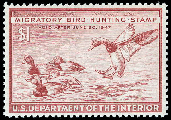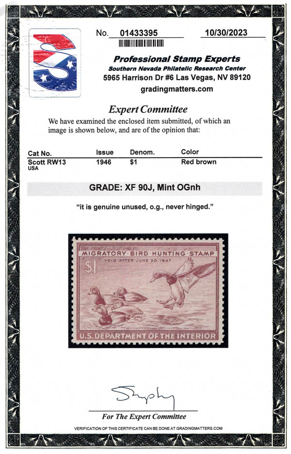 Federal Duck Stamp, 1946, $1 Redhead Ducks (Scott RW13), o.g., never hinged, Extremely Fine, with 2023 P.S.E. certificate graded XF 90J. Scott $50. SMQ $145.