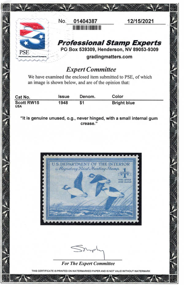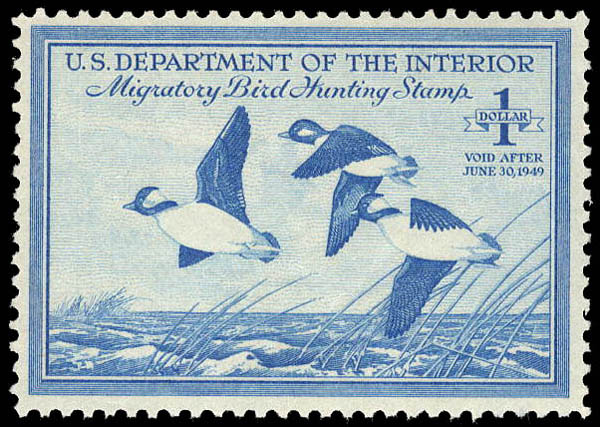 Federal Duck Stamp, 1948, $1 Buffleheads (Scott RW15), o.g., never hinged (with a small internal gum crease), Very Fine overall, with 2025 P.S.E. certificate. Scott $60.