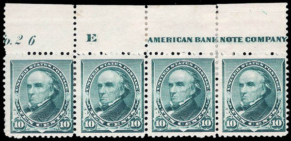 Lote 524![]() 1890, 10¢ Webster, green (Scott 226), strip of 4 with plate number and part imprint, o.g., hinged; perf thins on the top left stamp, otherwise Fine, with 2025 P.S.A.G. certificate. Scott $640. Estimate $150 - 200. |