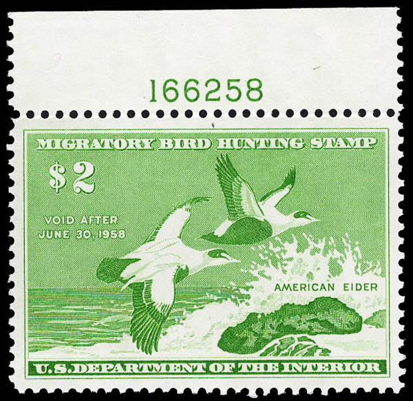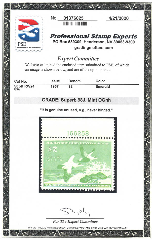 Hunting Permit, 1957, $2 American Eider (Scott RW24), plate number single, o.g., never hinged, Superb, with 2020 P.S.E. certificate graded SUP 98J. Scott $85. SMQ $750.
